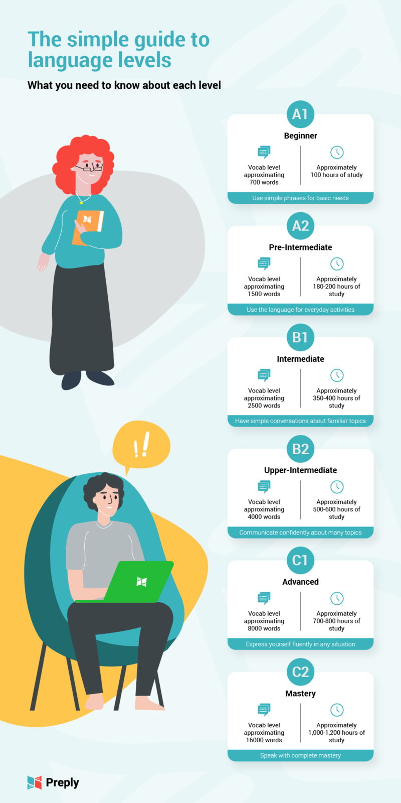 Уровни владения английским языком CEFR - отличный инструмент для оценки ваших текущих языковых навыков. Однако имейте в виду, что многие цифры, приведенные в этой статье, — количество часов и объем словарного запаса — основаны на средних значениях. Вы можете увидеть более быстрый или более медленный прогресс в зависимости от того, насколько вы знакомы с языком и сколько времени посвящаете изучению.